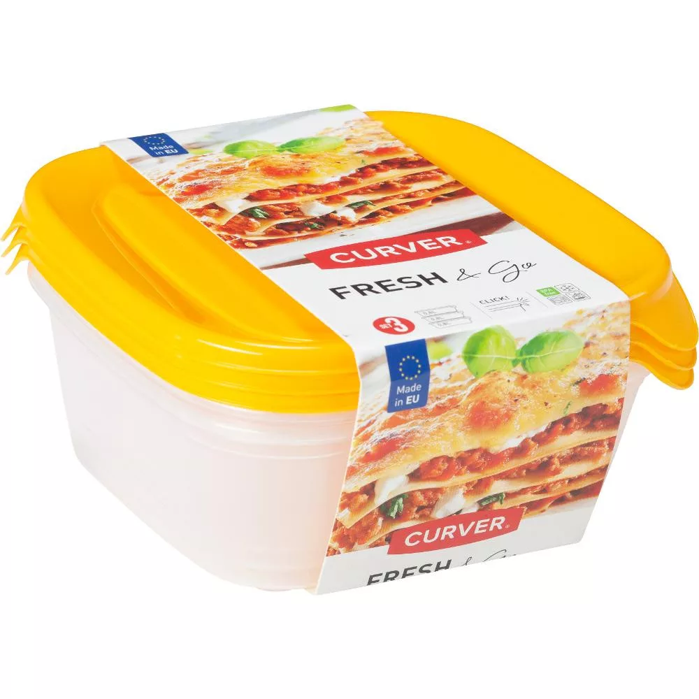 CURVER 182218 "FRESH&GO" SZÖGLETES ÉTELTARTÓ SZETT 3x0,8L - TRANSZPARENS/NARANCSSÁRGA