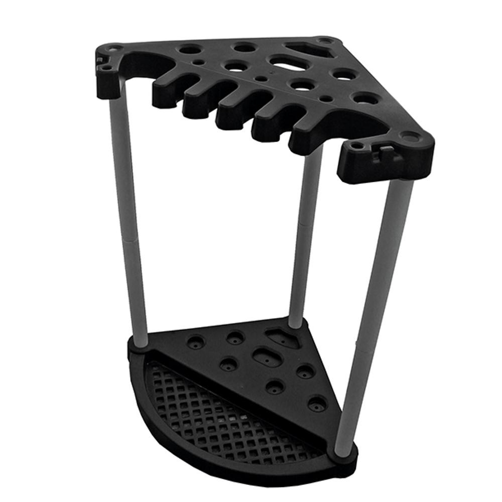 A Corner Tool Rack egy funkcionális sarok állvány kerti szerszámok tárolására. Lapátok, gereblyék és egyéb szerszámok rögzítésére alkalmas nyílásokkal rendelkezik. Könnyű összeszerelni - a maximális stabilitás érdekében a garázs falára, tárolóra vagy szerszámos házra is rögzíthető. A termék magas minőségű műanyagból készült, ezért ellenáll a külső hatások okozta sérüléseknek és az időjárás viszontagságainak.