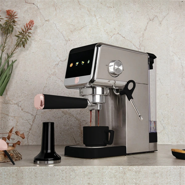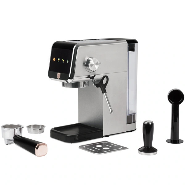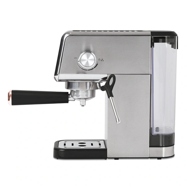 Az Espresso digitális kijelzős kávéfőző a Black Rose Collection része, amely a modern konyhák elengedhetetlen kelléke. Ez a kávéfőző nemcsak a funkcionalitásával, hanem a stílusával is lenyűgöz. A rozsdamentes acél és a fekete-rose gold színkombináció elegáns megjelenést kölcsönöz neki, így bátran kihelyezheted a konyhapultra, nem kell elrejtened a fiókban.