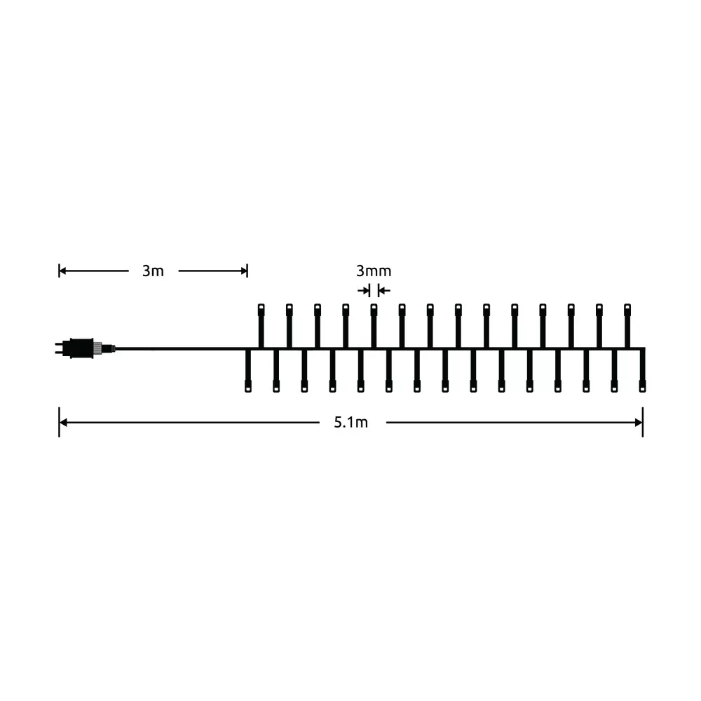 Méreteit tekintve 5,1 méter hosszú, ebből 2,1 métert tesz ki a fénnyel teli zöld kábel amikre összesen 384 darab LED chip van szerelve, 3 méter pedig a csatlakozó. Elhelyezése roppant egyszerű. Csatlakozás szempontjából EU szabvány dugvillával csatlakoztatható a hálózatra.