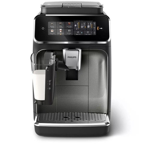 Philips 3300 LatteGo automata kávégép: 6-féle italvariáció Iced Coffee programmal, 12 fokozatú őrlési beállítás, kerámia őrlőbetét, LatteGo tejhabosító, AquaClean filter, Memo funkció, Vízkőjelzés, Kivehető központi egység, Őrölt kávé opció, Alap LED kijelző színes érintőgombokkal, prémium előlap és műanyag kivitel, fém csepptálca, 0,2L tej kapacitás, 1,8L víztartály, 275g AromaSeal kávébabtartály, Mini MyCoffeeChoice 3 dimenzió mentén + rejtett hőfokbeállítás, állítható kifolyócső, SilentBrew - extra halk örlés