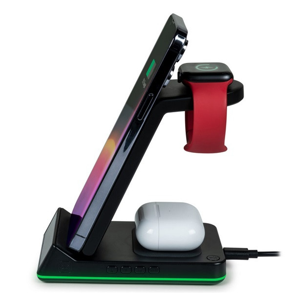 - 4 az 1-ben töltőállomás ( * ): 3 zónás indukciós töltő (okostelefon 10W, iWatch® 2,5W + vezeték nélküli fülhallgató 5W) + USB A 5V 1A kimenet