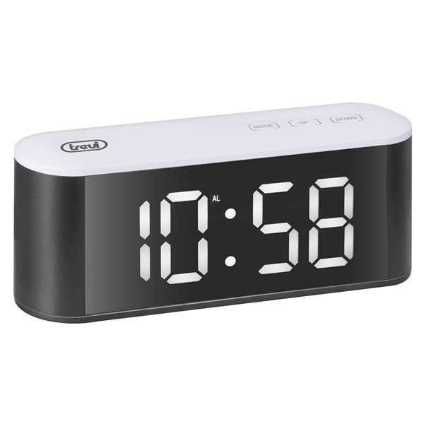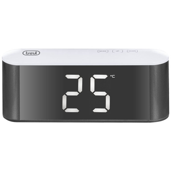 A hőmérővel ellátott TREVI EC 883 BL digitális óra a legjobb választás arra, hogy ne késsen el reggel, és ne csak az időt, hanem a hőmérsékletet is kontroll alatt tartsa, ami jól látható a nagy fehér LED kijelzőjén. Az elegáns tükrös előlappal és kényelmes érintőgombokkal felszerelt TREVI EC 883 BL segítségével gyorsan beállíthatja az ébresztési időpontot elektronikus csengőhanggal. A Szundi funkcióval egy pillanatra leállíthatja az ébresztést, míg a Dimmer funkcióval 3 különböző szinten állíthatja be a kijelző fényerejét. A Trevi óra 3 db „AAA” típusú mini ceruzaelemmel (nem tartozék), vagy a tartozék tápkábellel működik, ami ideális a folyamatos világításhoz. A kicsi, kompakt és elegáns TREVI EC 883 BL digitális óra ébresztővel és hőmérővel a tökéletes eszköz az Ön igényeinek! Műszaki adatok: