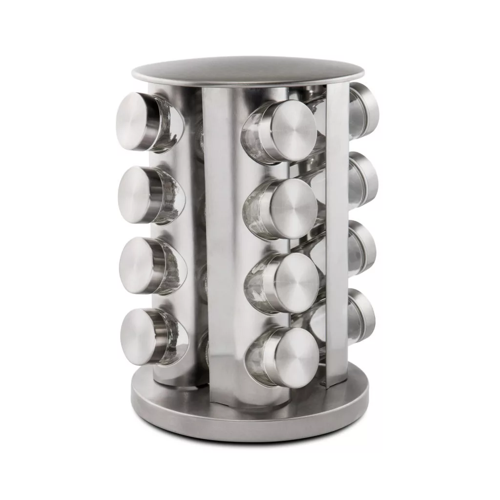 A készlet tartalma: egy mozgatható szatén rozsdamentes acél tartó, amely 360°-ben  elfordítható és 16 üveg tároló, rozsdamentes acél tetővel.