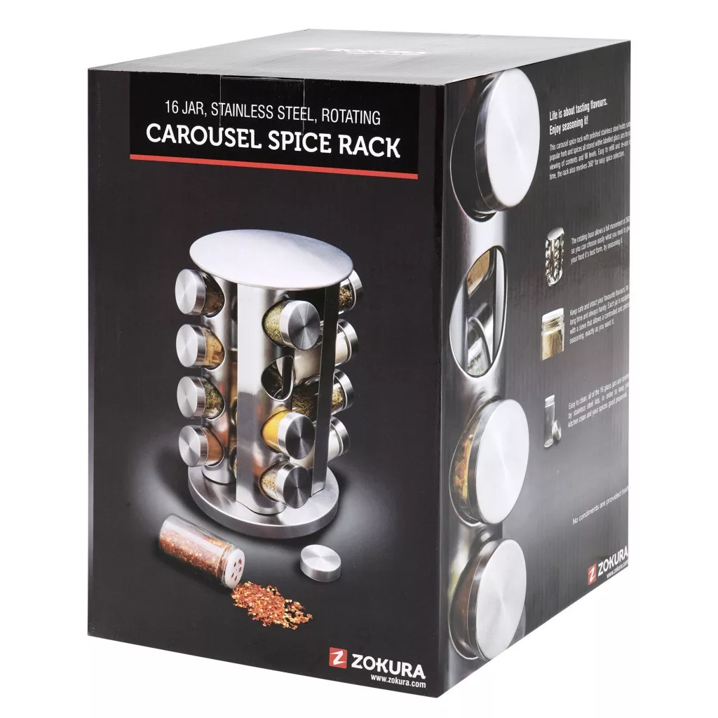 Tartsa fűszereit biztonságban a Zokura fűszertartó készlet segítségével. A készlet tartalma: egy mozgatható szatén rozsdamentes acél tartó, amely 360°-ben  elfordítható és 16 üveg tároló, rozsdamentes acél tetővel. Segítségükkel az ízek érintetlenek maradnak és csak akkor bontakoznak ki, amikor belekerülnek az ételbe.  Hasznos és praktikus, a készlet minden konyhában megtalálja a helyét, méretei 19 x 28 cm. A készlet (az állvány és a tartók) tisztíthatóak a mosogatógép felső kosarába helyezve, a műanyag sziták csak kézzel mosható