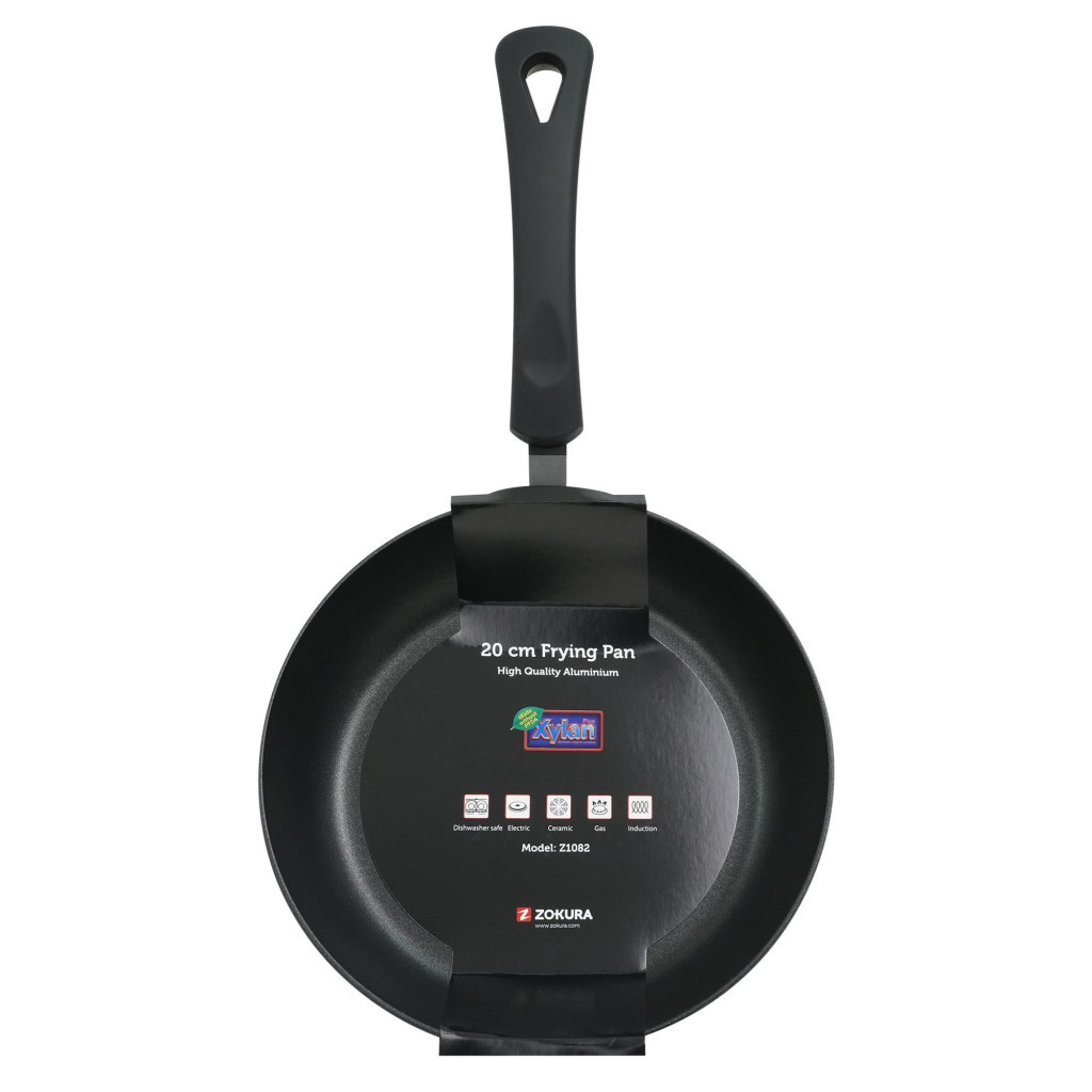 Zokura serpenyő, 20 cm átmérőjű, préselt alumíniumból, Xylan Plus tapadásmentes bevonattal, 4 cm magas. A préselt alumínium váz gyorsan és egyenletesen melegít. Az alap gáz-, elektromos és kerámia főzőlapokhoz alkalmas. A kiváló tapadásgátló tulajdonságokkal rendelkező Xylan Plus kettős tapadásgátló bevonat megakadályozza az ételek odaragadását és könnyen tisztítható. A tapadásmentes bevonat PFOA mentes. A hosszú, kiváló minőségű, szegecselt nyél bakelitből készült, puha tapintású bevonattal a biztonságos és könnyű kezelhetőség érdekében. Mosogatógépben mosható.