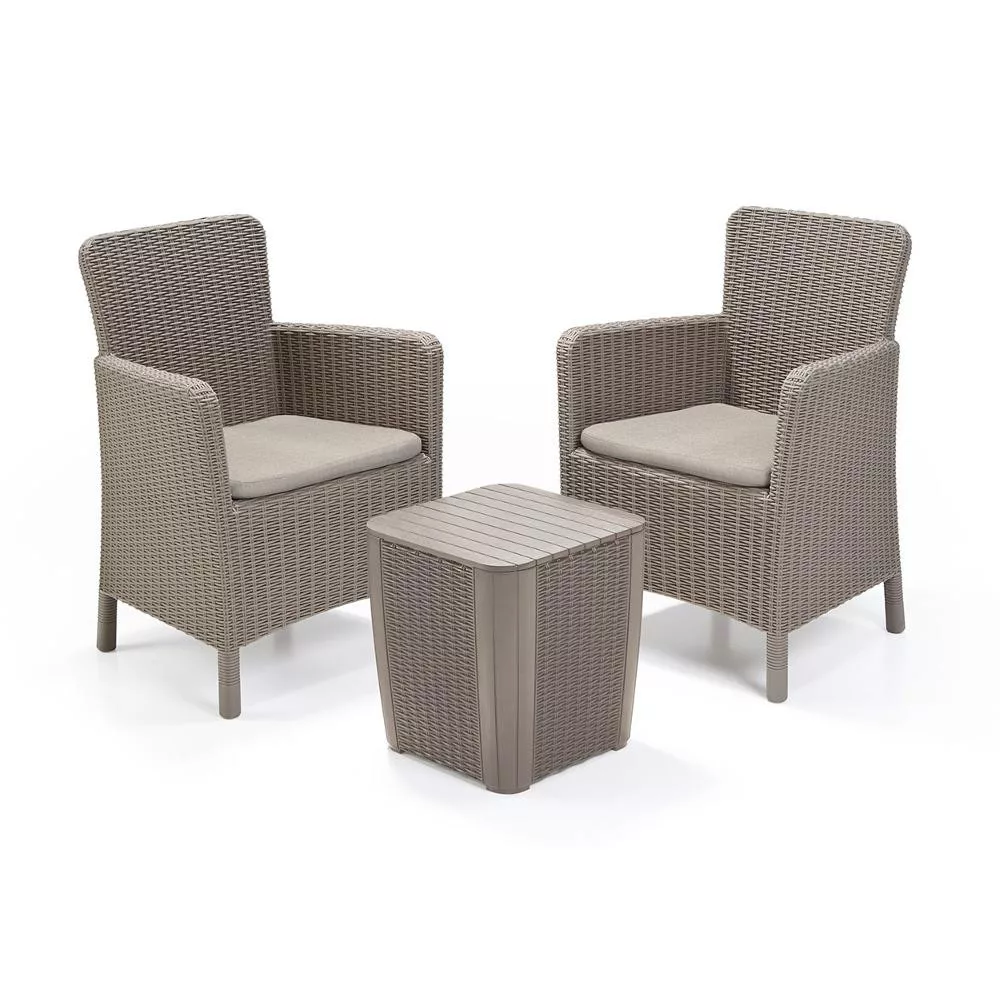 A Trenton Balcony egy lekerekített, rattan hatású stílussal rendelkező erkélyszett, amely két karosszéket és egy 2 funkciós, különböző kerti tárgyak és kiegészítők tárolására alkalmas Luzon asztalt tartalmaz. A megfelelő profilú üléstámlák és a puha párnák nagyon kellemessé teszik a szabadban töltött pihenés pillanatait. A könnyen tisztítható bútorszett tartós és ellenáll a kedvezőtlen időjárási körülményeknek, valamint az UV-sugaraknak. Klasszikus színekben kapható, összeszerelése nagyon egyszerű, nem igényel speciális szerszámokat.