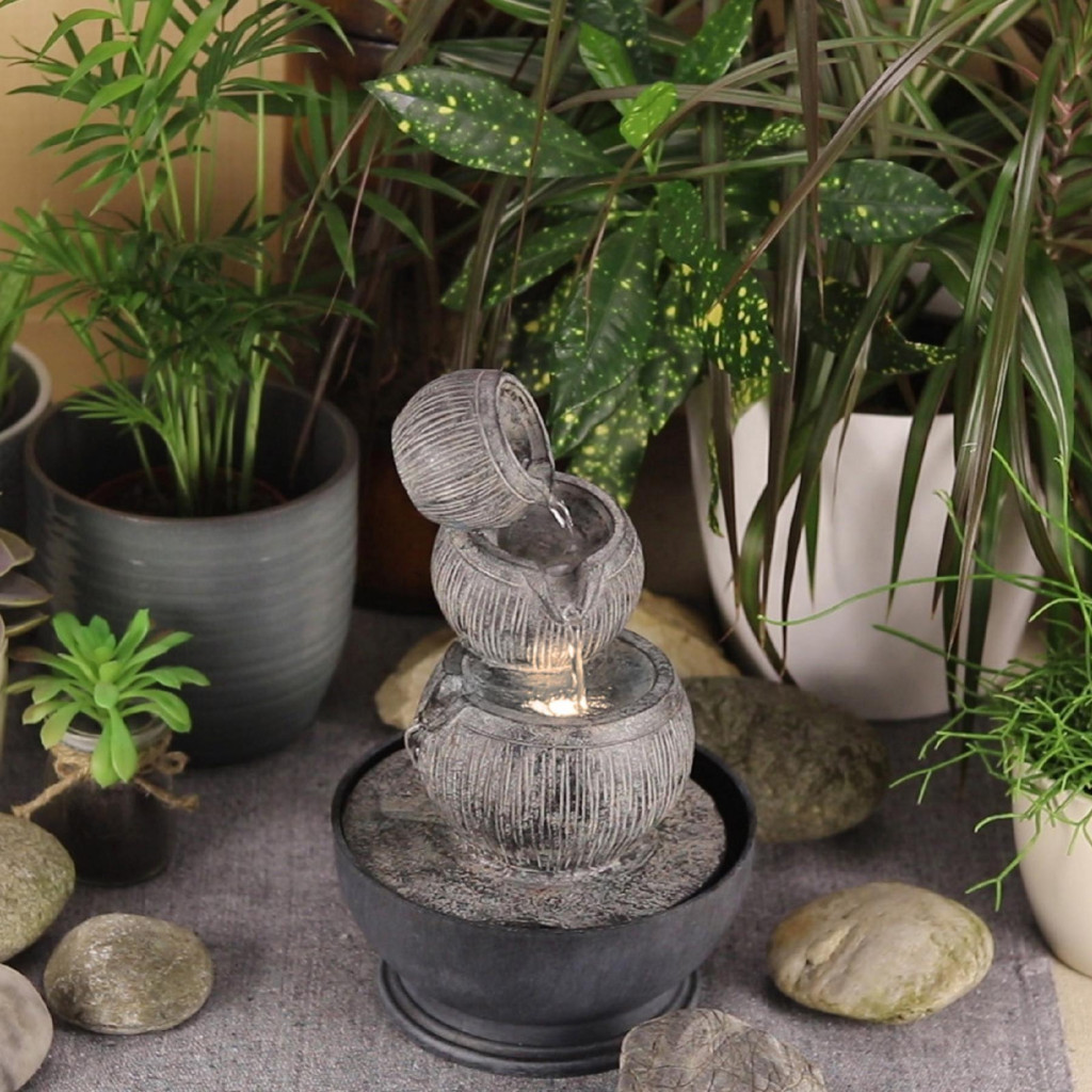 A csobogó polyresin alapanyagú, kőhatású beltéri kivitelű, a melegfehér LED fényével tökéletes hangulatú dekorációjává válhat a nappalijának, télikertjének.