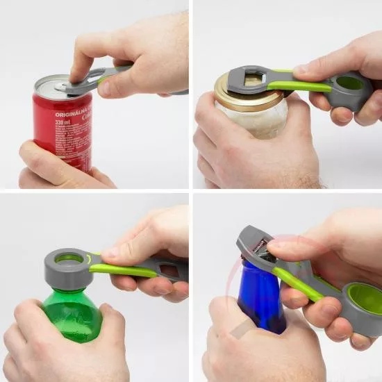 Ennek a praktikus eszköznek a segítségével könnyen lelazíthat egy műanyag üdítős flakon kupakot, felbonthat egy sörösüveget vagy egy doboz üdítőt,  valamint segít a befőttes üveg kupakja alá levegőt juttatni, hogy az könnyebben felbontható legyen.