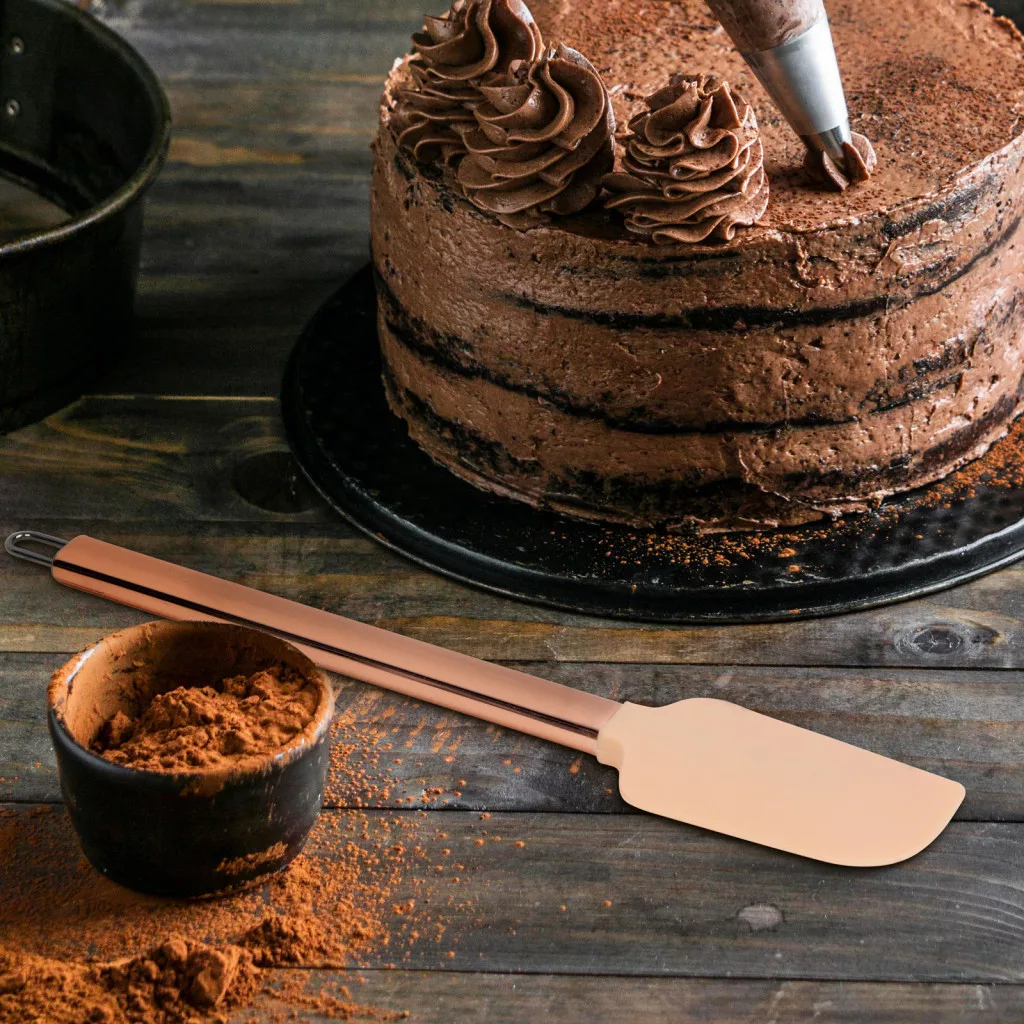 Jól felszerelt konyhák alap kelléke a szilikon spatula, amely segítségével könnyen formázhat, keverhet habokat, krémeket, szószokat.A spatula, hőálló szilikonból készült rugalmas feje megakadályozza, hogy főzés közben sérüljön az edény felülete.A spatula rozsdamentes acél nyéllel rendelkezik, amely elegáns megjelenést és tartósságot nyújt a használat során.A hosszú nyél könnyen kezelhető, kényelmes és hatékonyan használható.