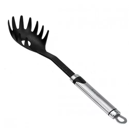 - Műanyag spaghetti kanál rozsdamentes acél markolattal és akasztóval.- Helytakarékos, felfüggeszthet- A tészta nem ragad le és nem törik össze a kanálban.- Tulajdonságok:- Kanál anyaga: műanyag- Nyél anyaga: rozsdamentes acél- Szín: ezüst/fekete- Teljes hossza: 32 cm