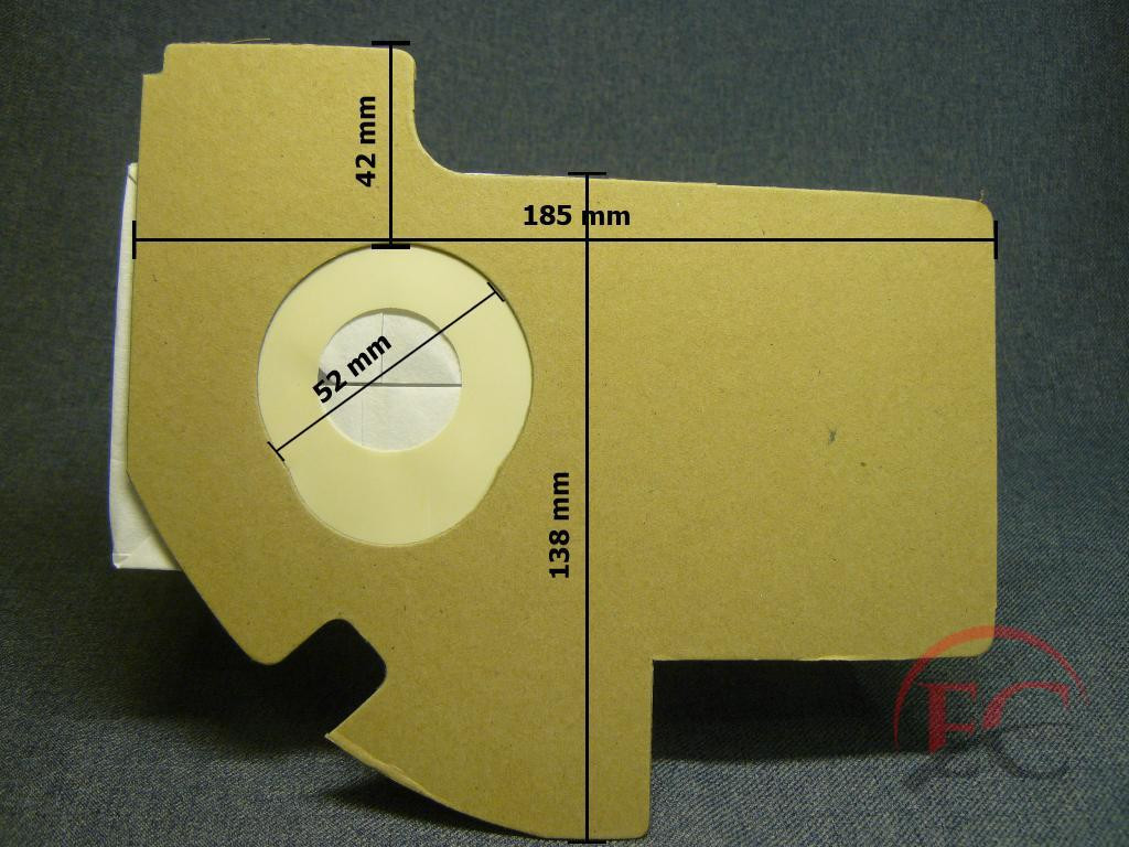Lyuk átmérő: 62mmLyuk átmérő: 57mmLyuk távolság: 42mmMagasság: 100mmSzélesség: 185mmZsák hosszúság: 215mmZsák magasság: 85mmZsák szélesség: 189mm