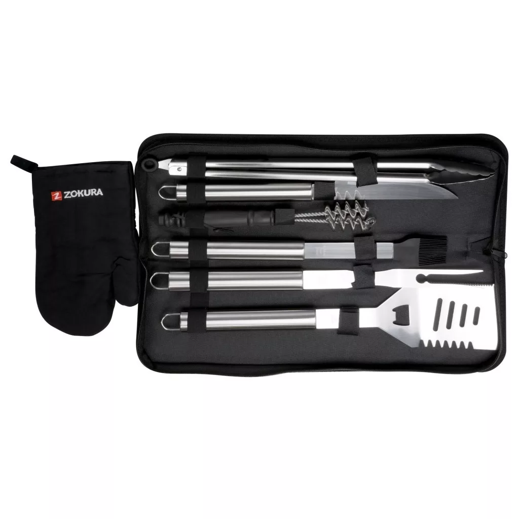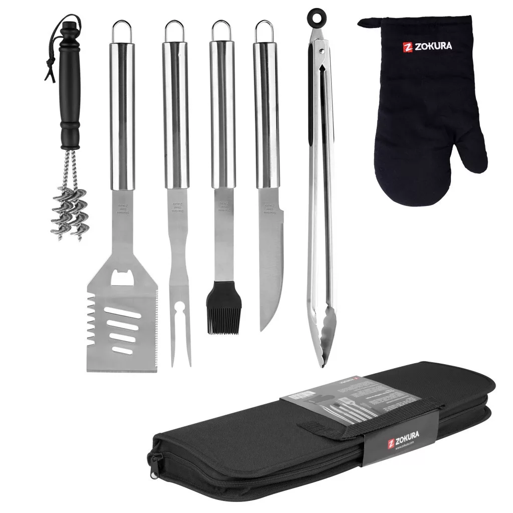 A Zokura grilleszköz készlet 8 darabból áll, és az ízletes grillezett ételek elkészítéséhez szükséges és alapvető eszközöket kínálja.